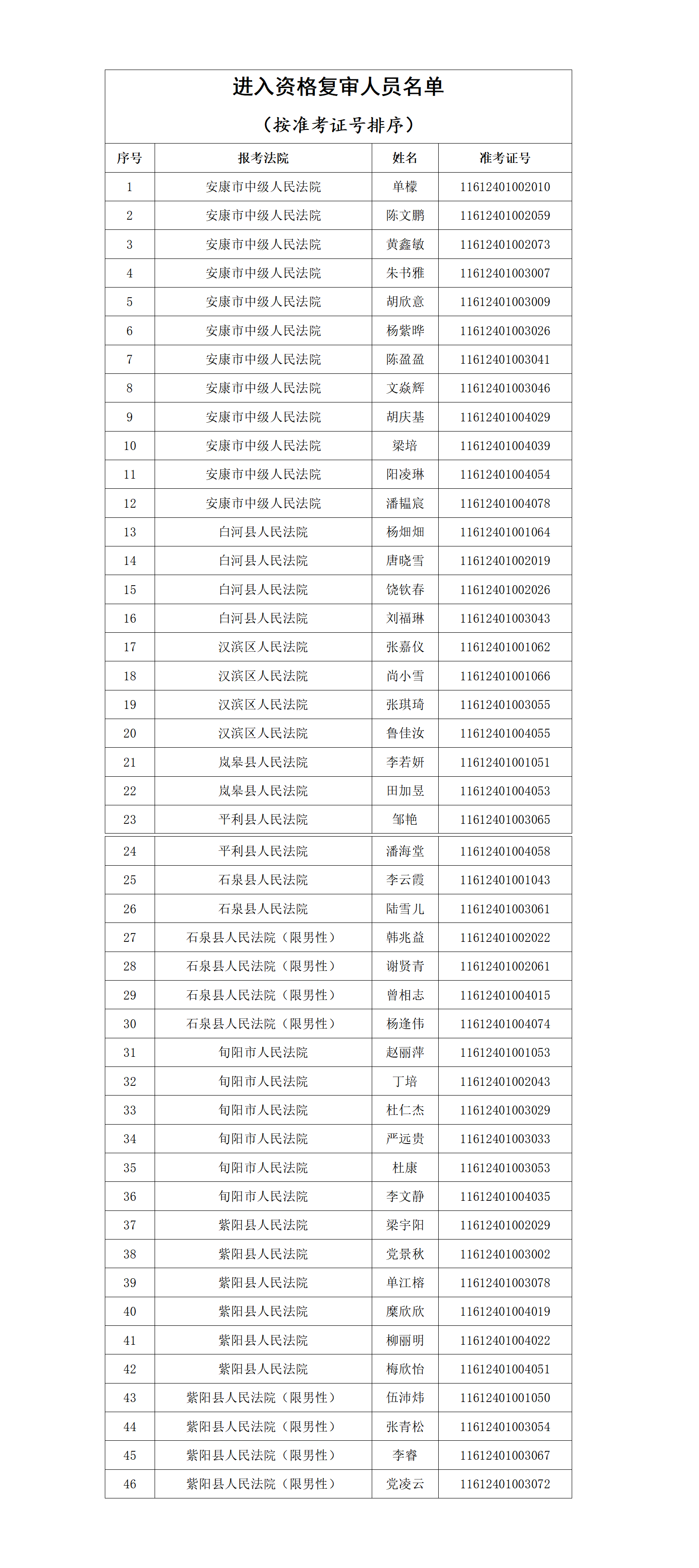 資格復(fù)審工作結(jié)束3日內(nèi),進(jìn)入面試人員名單在安康市中級(jí)人民法院及陜西秦潤(rùn)人力資源集團(tuán)有限公司官網(wǎng)和微信公眾號(hào)上進(jìn)行公布。